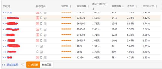 关于选择关键词这一块来说,我的建议是用系统推荐的就可以,因为系统推荐的可以看到展现、竞争、点击率等核心数据,然后根据这些数据去选择我们的关键词,前期的选择上要看的数据是展现指数和点击率,因为前期质量得分低以及预算等原因选择5000-2000展现指数的就可以了,点击率的话最好在3%以上,当然点击率越高越好。这里插一句话,质量分是直通车的核心,我这里有一个直通车三天十分的技巧,需要的可以加我旺旺,北蔡说,回复,质量分,送你。后期因为我们需要的是更多的访客和转化,所以可以选择展现指数高一点的,转化率的话2%以上就可以了。如果这些可以选到合适数量的就不考虑了,如果选不到合适的可以降低一些标准,然后注意看数据反馈去优化也是可以的。