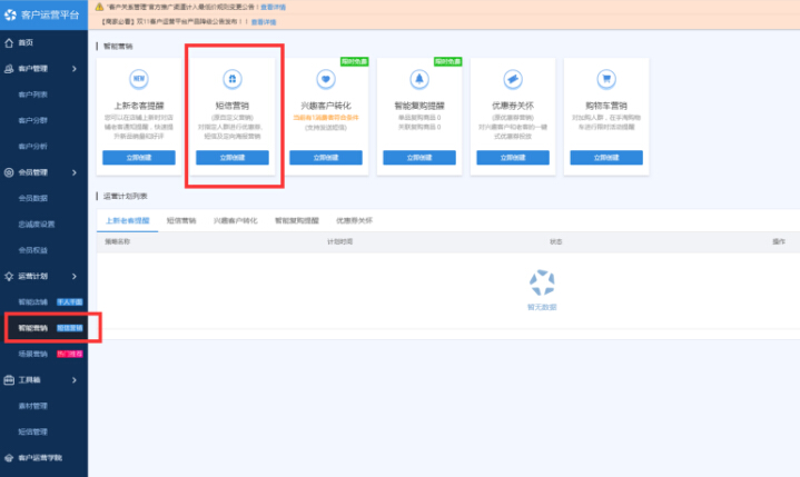 短信维护;可以通过客户运营平台来进行短信营销的设置;