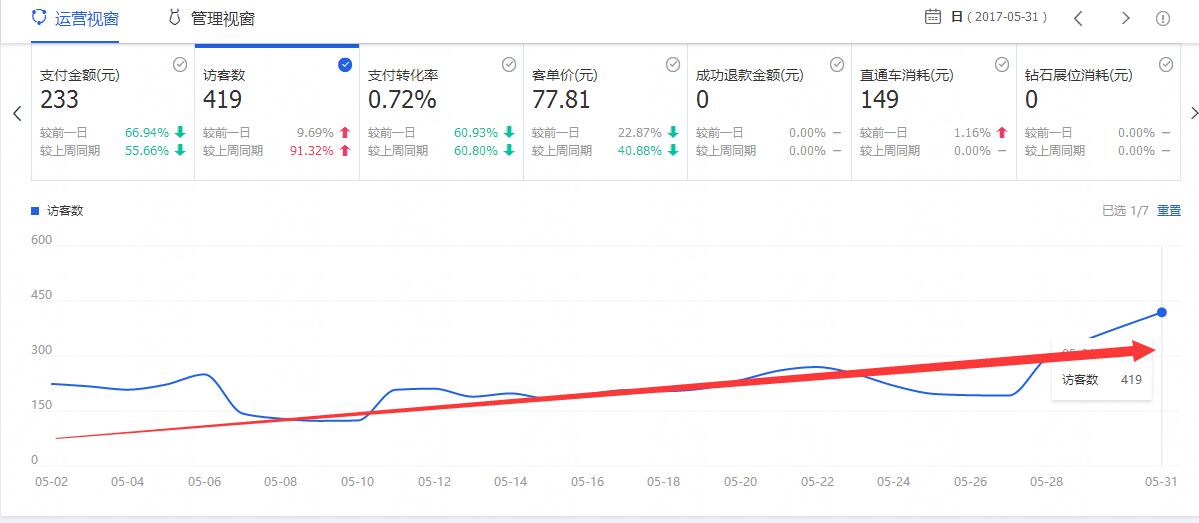 店铺的访客数,最高值是400多个访客,而支付转化率就更低了,且极不稳定