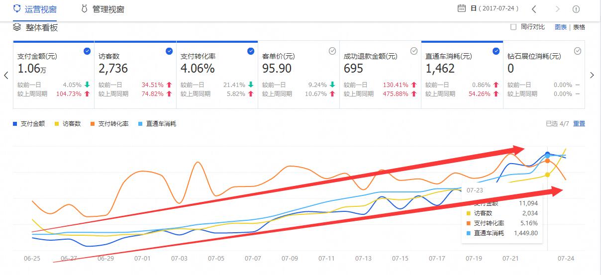 7月份正值暑假与高温时期,极大的激发了热爱健身消费人群的消费欲望,产品基础销量起来后,通过单品搜索进店的访客与转化率呈阶梯式的增长,支付金额,访客数,支付转化率,直通车消费 4条曲线齐刷刷的往上