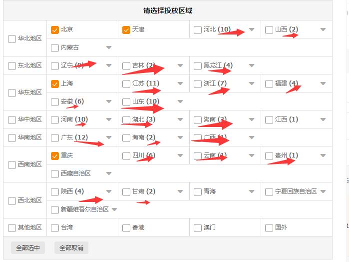 二个是投放地域的精准化,这个也是重中之重,为何呢,因为地域不仅仅是会影响到一个点击率的高低也是会影响到一个转化率的效果,不同的产品对于不同的地区消费者喜好度是不一样的,例如 卖防雾口罩的 那肯定是 北京,河北,天津等地域需求量大及需求性高,因此,我会针对产品本身去研究圈点出各个省份点击与转化最高的城市去投放,注意,这里讲的是各个省份的优质城市而不是直接投放省份